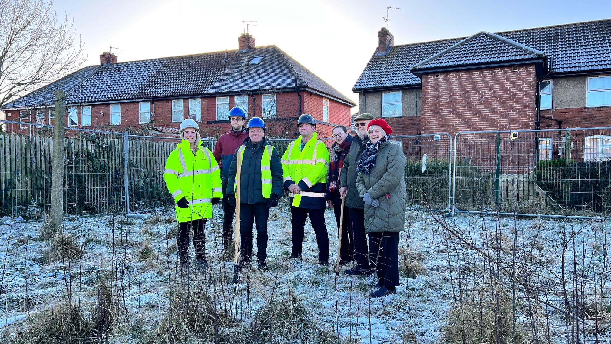 To celebrate the start of this project, colleagues from Joseph Rowntree Housing Trust (JRHT), residents, local councillor Ben Burton and team members at RH Fullwood (contractor who is building the homes) gathered on-site.